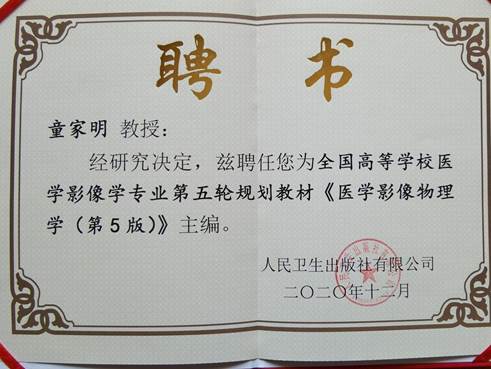 2021年3月22日,全国高等学校医学影像学专业第五轮规划教材主编人会议在天津召开。胜游体育(SYsports)官方网站入口童家明教授被聘任为全国高等学校医学影像学专业第五轮规划教材《医学影像物理学(第5版)》主编。据悉,全国高等学校医学影像学专业第五轮规划教材拟定于2022年5月出版发行,供全国院校教学选用。