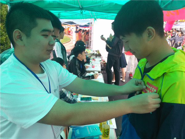 在物理学院报到现场,新生们看到了佩戴蓝底红色“胜游体育(SYsports)官方网站入口志愿者”字样胸贴时,他们知道这就是自己的学长们;报到手续结束,志愿者们会给新生佩戴红底黄字的新生胸贴,标示从此刻“你是我们的一员了”;现场有的新生同时佩戴两种胸贴,积极参与迎新中。
