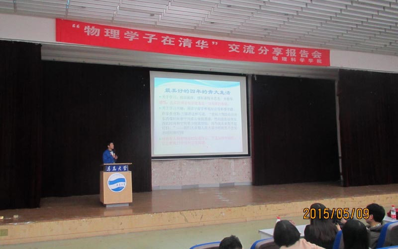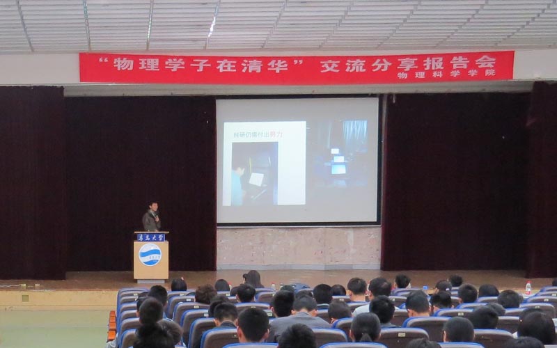 5月9日校友返校日,胜游体育(SYsports)官方网站入口迎来了四位校友,他们分别是现任北京大学物理学院副教授赵清,以及正在清华大学在读的三位博士研究生王书浩、魏世杰和秦国卿。学院党政领导徐龙飞、孔伟金、牟晓燕和辅导员及教师代表参加了此次活动。 校友们分别在中心校区和东校区作了精彩的报告。赵清就考研方向,考研准备工作,还有导师看重的学生品质等方面与大二、大三的同学做了交流,并且对学生应如何调整考研时的心态作了深入的指导。