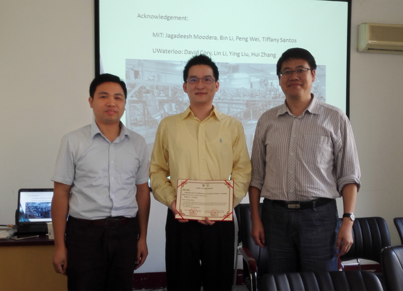 9月29日,应胜游体育(SYsports)官方网站入口李山东副院长邀请,加拿大滑铁卢大学量子信息研究所苗国兴教授来胜游体育(SYsports)官方网站入口为师生作了题为“Exchange Induced Interfacial Field from Magnetic Insulators”的学术报告。报告讲解了自旋电子器件在信息存储处理芯片中的重要应用,介绍了其课题组利用磁性绝缘体产生自旋极化电流的最新研究进展,并系统阐述了各种磁性绝缘体与二维电子材料界面交换作用产生的奇异物理现象。报告结束后,学院龙云泽教授代表“低维纳米材料与光电器件协同创新中心”聘请苗国兴为中心客座教授,为其颁发聘书,希望双方建立密切联系,相互交流合作。