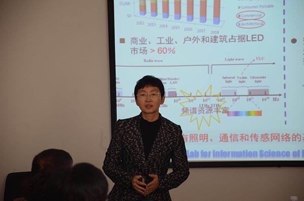 会上,迟楠教授首先作了《高速LED光通信系统原理、结构与实践》的学术报告,她简要介绍了可见光通信的国内外发展现状、研究意义、涉及的几项关键技术以及她所领导的团队在多维多阶调制、编码及均衡、复用及组网、材料与芯片四个方面的研究进展,存在的五个关键问题。