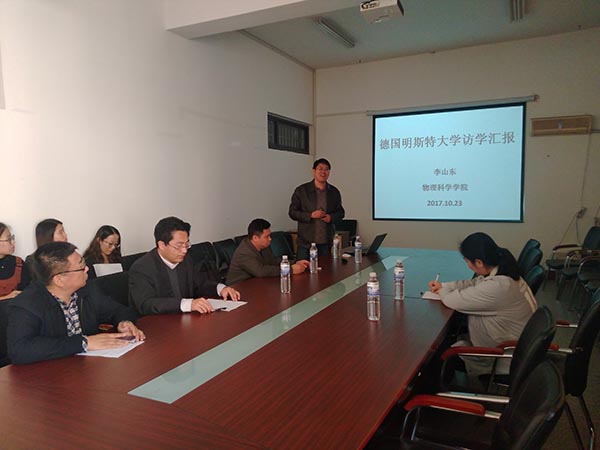 李山东作了《德国明斯特大学访学汇报》的报告,他首先结合案例生动有趣、图文并茂地阐述了磁子学和自旋波电子学的有关研究情况,通过其在台湾清华大学、美国东北大学和德国明斯特大学三次出境访学的切身经历谈了自己在外研究和学习的一些体会,并从思维方向差异、宗教文化差异等方面介绍了欧美与中国思维和文化的差异及其对科学研究态度和成果认定等的影响。