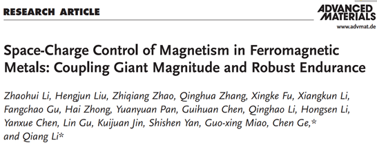 磁电耦合调控是发展低功耗、非易失、快速度、多功能自旋电子器件的关键,蕴含着丰富的物理内涵和巨大的应用前景。近日,胜游体育(SYsports)官方网站入口李强教授课题组提出了一种全新的调控策略——空间电荷磁电耦合机制,为载流子相关的物性调控研究提供了一种新思路。相关研究成果以“Space-charge control of magnetism in ferromagnetic metals: coupling giant magnitude and robust endurance”为题,刊发在材料领域著名期刊Advanced Materials上。论文第一作者是胜游体育(SYsports)官方网站入口2019届研究生李召辉(加拿大滑铁卢大学攻读博士学位)与2020届研究生刘恒均,胜游体育(SYsports)官方网站入口李强教授与中科院物理所葛琛研究员为论文通讯作者,青岛大学为第一通讯单位。