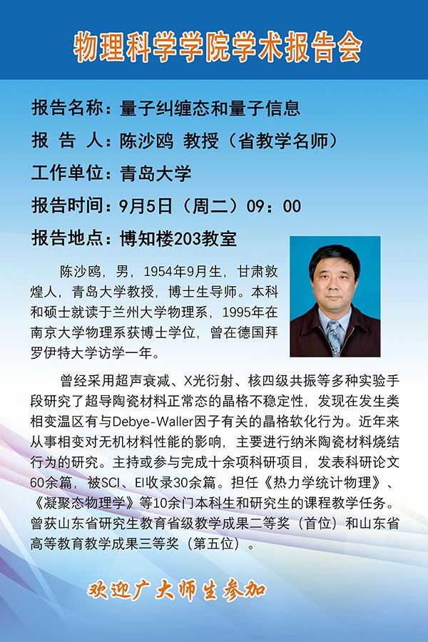 2017物理前沿学术报告第二十九讲:量子纠缠态和量子信息