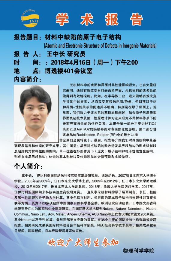 2018物理前沿学术报告第九讲:材料中缺陷的原子电子结构