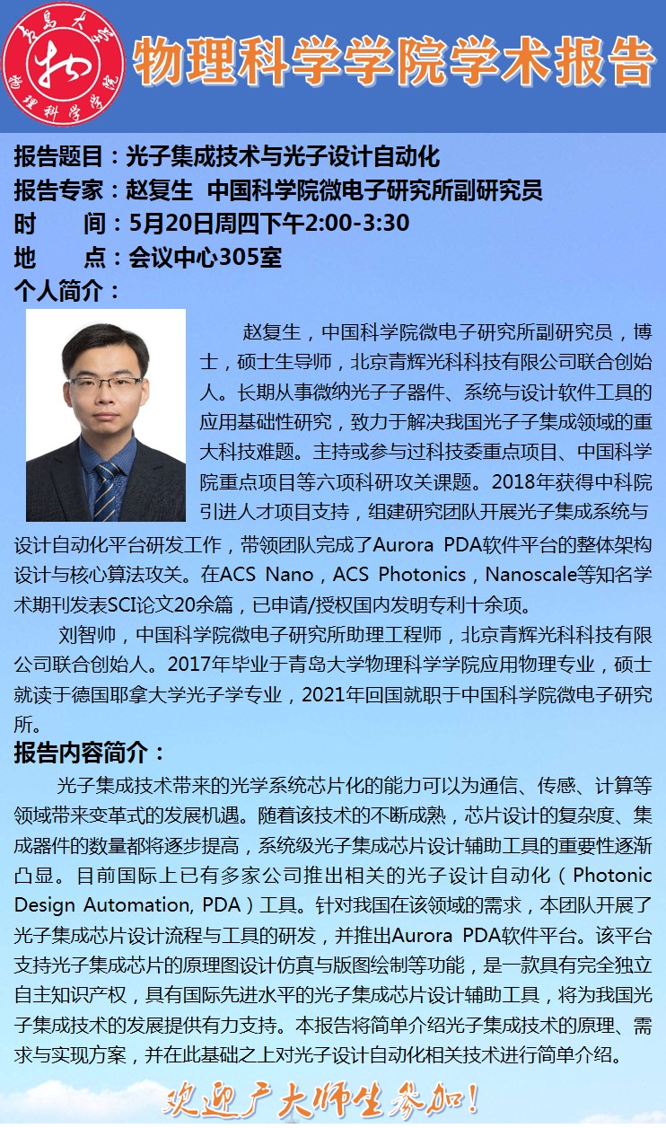 学术报告:中国科学院微电子研究所赵复生副研究员应邀来胜游体育(SYsports)官方网站入口作报告