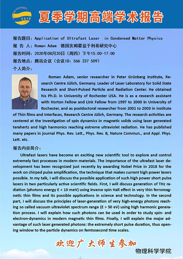 夏季学期高端学术报告:Application of Ultrafast Laser in Condensed Matter Physics