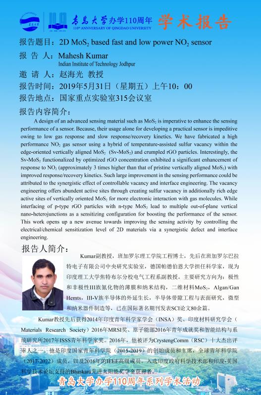 “新动能”物理学前沿学术报告10:2D Mos2 based fast and low power NO2 sensor