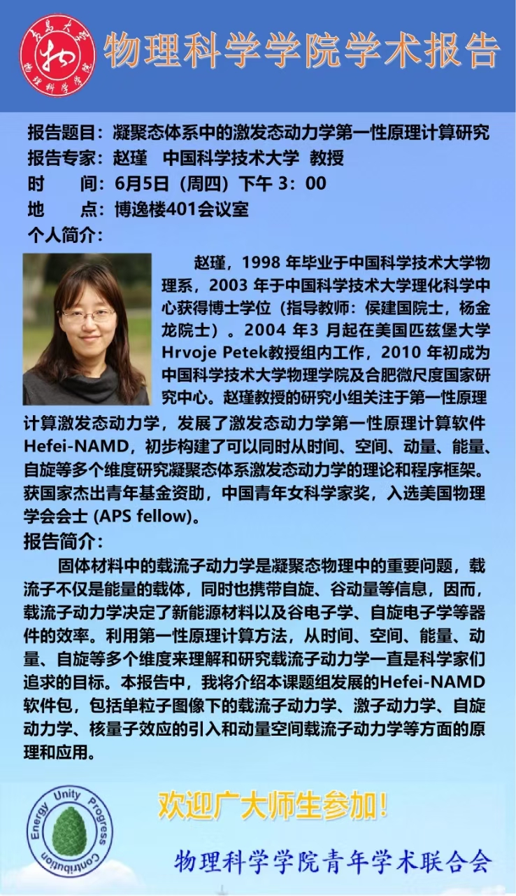 [学术预告]赵瑾-凝聚态体系中的激发态动力学第一性原理计算研究