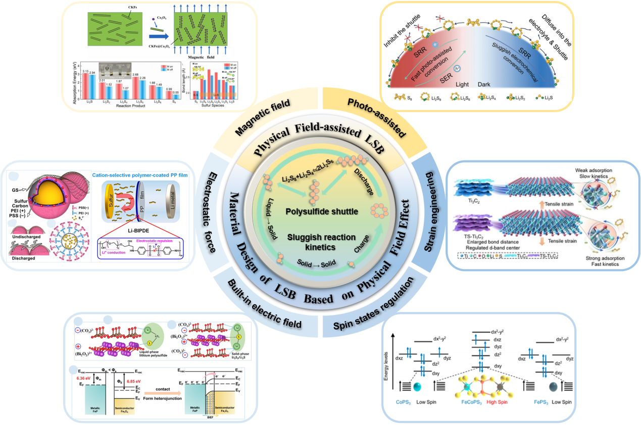 高理论能量密度锂硫电池(LSB)的发展一直受到多硫化锂(LPS)的穿梭效应和缓慢硫还原/氧化反应动力学问题的制约。近年来,基于物理场效应缓解穿梭效应并增强反应动力学的合理设计得到了广泛的研究,对硫物质的相互作用提供了更本质的见解。该文聚焦物理场效应,系统总结了LPS相互作用的方法和机制。具体而言,介绍了LSB系统的工作原理、穿梭效应的起源以及LSB系统中的动力学问题。然后,阐述了基于物理场效应概念的LSB相关材料的设计机制和应用,以及外部物理场辅助增强的LSB,对包括静电力、内置电场、自旋状态调节、应变工程、外部磁场、光辅助等策略进行了详细地阐述和讨论。最后,总结并展望了这些策略在提高LSB性能和减弱穿梭效应方面的潜在方向和见解。