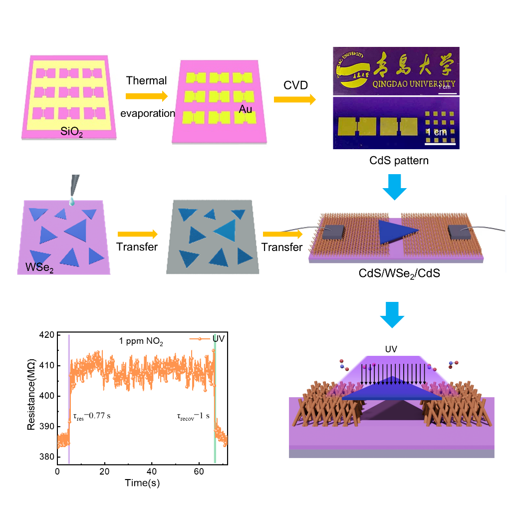 低维纳米结构,如二维材料广泛用于气体传感器,但由于敏感层结构紧凑,传感器在室温下灵敏度较低,响应和恢复速率较慢。基于低维纳米单元构筑的德华异质结,不仅耦合了多种材料的物化特性,还具有独特的界面电子性质。本论文报道了一种新颖的混合维度范德华异质结构,由化学气相沉积合成的三维CdS纳米线阵列和二维WSe2纳米片构建而成,用于光电增强气体传感器。在这种结构中,纳米线阵列既充当电极材料,又充当敏感层。结构内部丰富的空间有利于气体分子的扩散,从而提高传感器的性能。