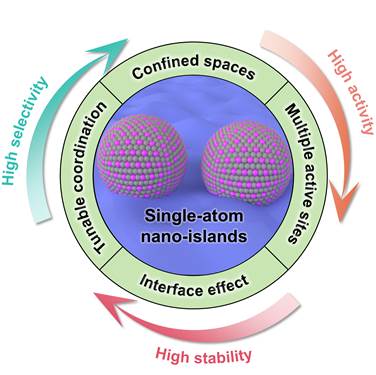 单原子催化剂,凭借其最大化的原子利用率、可调的微配位环境和独特的电子结构,已成为能源转化与存储领域的瞩目焦点。然而,这类催化剂在实际应用中常面临两大挑战:一是过大的表面自由能易导致原子团聚,二是过强的金属-载体化学键则可能引发活性位点钝化。为解决这些问题,具有空间限域的单原子纳米岛(SANIs)催化剂应运而生,其独特的结构设计在电催化领域展现出了卓越的高活性和稳定性。对此,论文综述了近年来SANIs催化剂在电催化领域的研究进展,深入剖析了SANIs在提升催化活性、增强稳定性、优化结构设计和提高选择性方面的显著优势。从材料选择、多界面相互作用以及配位结构等关键角度出发,系统总结了SANIs电催化剂的设计原则与策略。论文还详细讨论了SANIs催化剂当前面临的挑战,包括制备工艺复杂性、活性位点调控难度以及长期稳定性评估等,并展望了未来的研究方向。该研究旨在通过持续探索与创新,推动SANIs催化剂在多相催化领域的发展,加速其工业化应用进程,为能源转化与存储技术的革新贡献力量。
