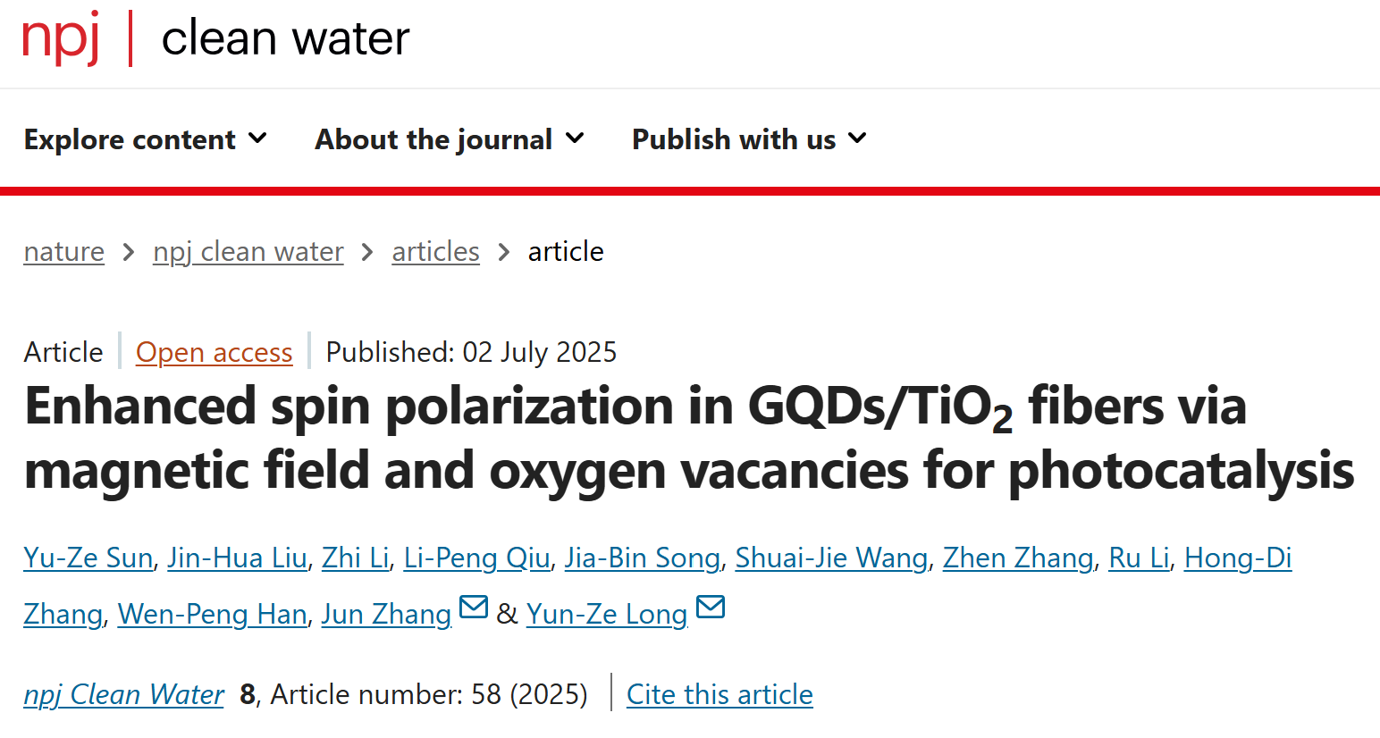 近日,胜游体育(SYsports)官方网站入口龙云泽/张俊课题组在《Nature》旗下刊物《npj Clean Water》(2025,8:58)上发表了题为《Enhanced spin polarization in GQDs/TiO2 fibers via magnetic field and oxygen vacancies for photocatalysis》(通过磁场和氧空位增强石墨烯量子点/二氧化钛纤维中的自旋极化用于光催化)的研究论文。论文第一作者是硕士研究生孙玉泽和博士研究生刘进华,通讯作者是张俊副教授和龙云泽教授。《npj Clean Water》的SCI影响因子为11.4,2024年发文量仅130篇。