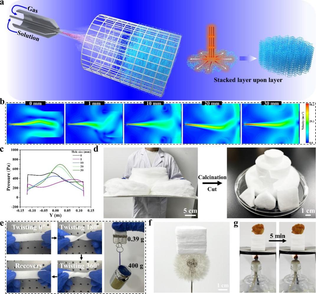 针对这一问题,本研究提出利用非晶态Al2O3修复BaTiO3纳米纤维中缺陷的策略来解决BaTiO3纳米纤维的脆性问题,并且通过空气动力学模拟优化了溶液喷射纺丝工艺,从而制备出柔性可压缩的三维结构BaTiO3/Al2O3陶瓷纳米纤维气凝胶。此外,该陶瓷纳米纤维气凝胶在多个方面表现出优异的性能和应用前景,例如,柔性可穿戴电子器件(压电响应时间极短:78 ms)、阻燃热防护(热导率极低:0.0275 W·m-1·K-1)、吸音降噪(降噪系数很高:0.67)、室温和高温过滤领域(过滤效率很高:PM0.3≥99.96%)。该工作有助于推动柔性压电陶瓷纳米纤维气凝胶的大规模生产和广泛应用。
