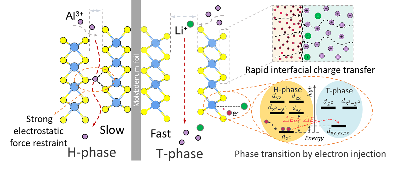 铝离子电池(AIBs)由于其独特的三电子氧化还原特性和高比容量,是最有前途的储能替代材料之一。然而,由于高电荷密度铝离子固有的强静电力导致其在层状插入型材料(例如,二硫化钼)体相和阴极-电解质界面处的扩散均受限。研究团队研究了影响阴极-电解质界面电荷转移速率和二硫化钼稳定相变的关键因素。空间位阻效应导致插入过程中电极-电解质界面上Li+积累过多(8 wt%),导致界面扩散能垒显著增加,Al3+固相扩散困难。相反,当Li+含量降至3.33 wt%时,Al3+的界面扩散能垒明显降低。这种减少,以及非积累的Li+的深度嵌入,促进了阴极内稳定和高质量的T相转变,有效地降低了层间范德华力。同时阐明了多阳离子共插层的电荷存储和氧化还原机理,并首次量化了Al3+和Li+在电化学插层过程中的容量贡献率。这种方法同时解决了界面扩散缓慢和具有挑战性的三价铝离子固相插层两个主要问题。