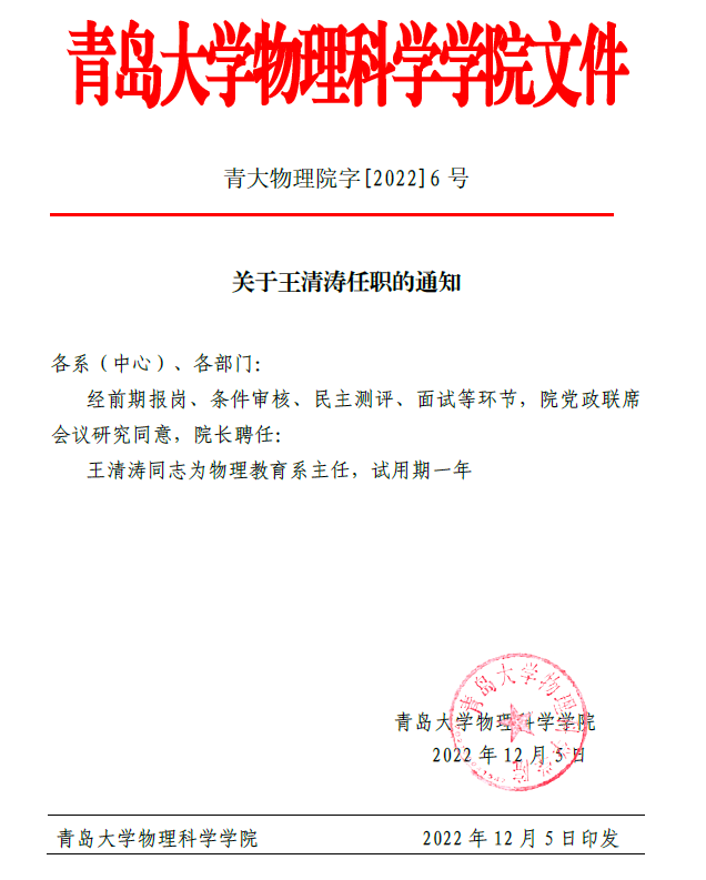关于王清涛任职的通知