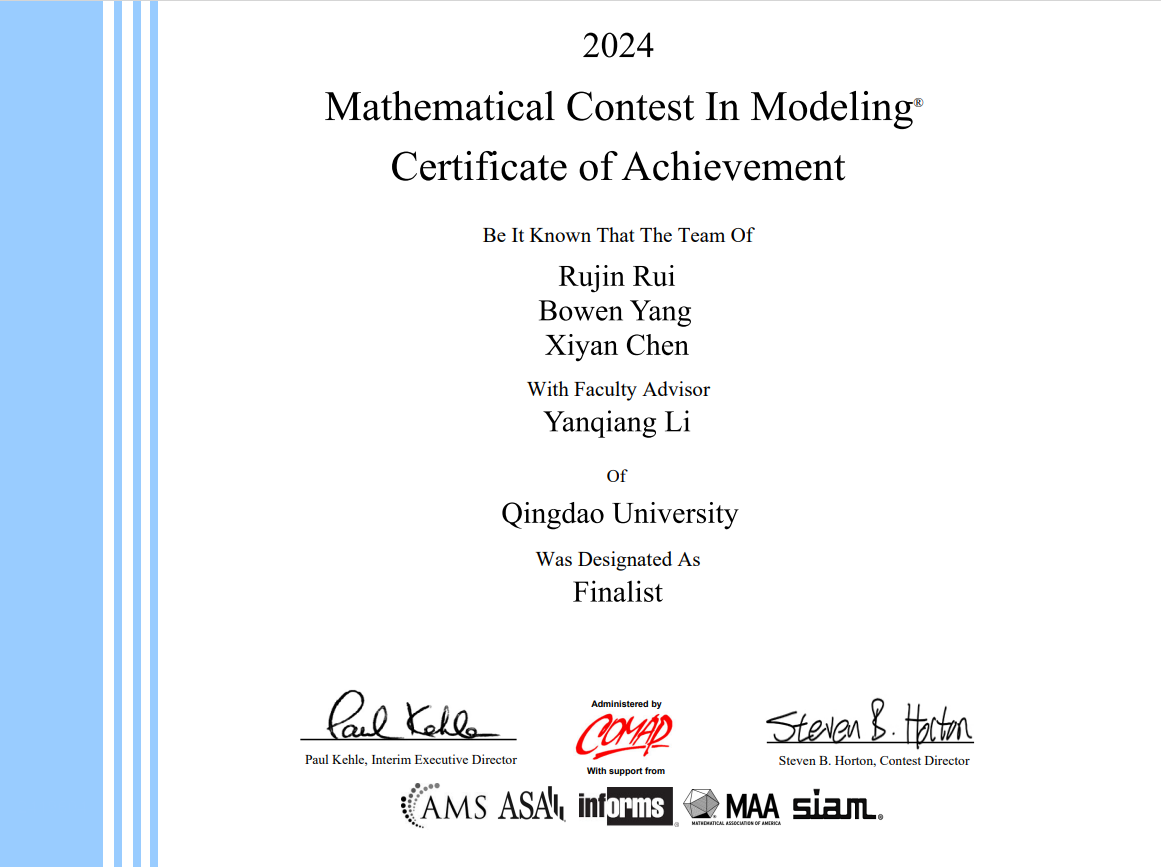 近日,2024年美国大学生数学建模竞赛(Mathematical Contest in Modeling/ Interdisciplinary Contest in Modeling, MCM/ICM)成绩正式揭晓。由胜游体育(SYsports)官方网站入口2022级应用物理专业茹锦瑞、杨博文、陈西艳组成的参赛队夺得特等提名奖(Finalist奖)。