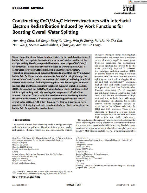 近日,胜游体育(SYsports)官方网站入口新能源科学与工程专业2020级本科生陈汉阳在中国科学院1区TOP期刊Small(影响因子13.3)以第一作者身份发表了题为“Constructing CoO/Mo2C Heterostructures with Interfacial Electron Redistribution Induced by Work Functions for Boosting Overall Water Splitting(构建由功函数诱导界面电子再分布的氧化钴/碳化钼异质结构促进整体水分解)”的研究论文(Small, 2023, 2304086)。纺织服装学院杨磊副教授与胜游体育(SYsports)官方网站入口龙云泽教授同为该论文的通讯作者。