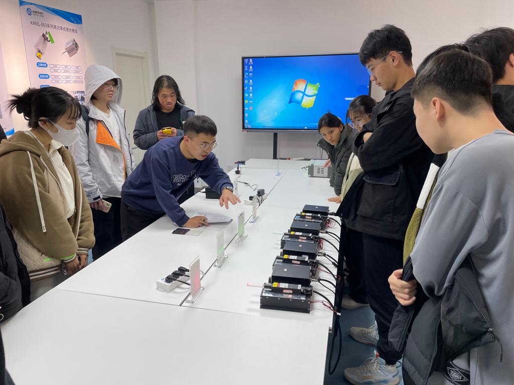 随后同学们参观了中心激光产品中试基地生产线,学习了激光晶体和固体激光器的工业生产和加工流程,同学们通过参与对部分产品器件的动手调节,以及与中心工作人员的深入探讨,加深了对相关晶体学知识和激光的认识,开拓了视野。
