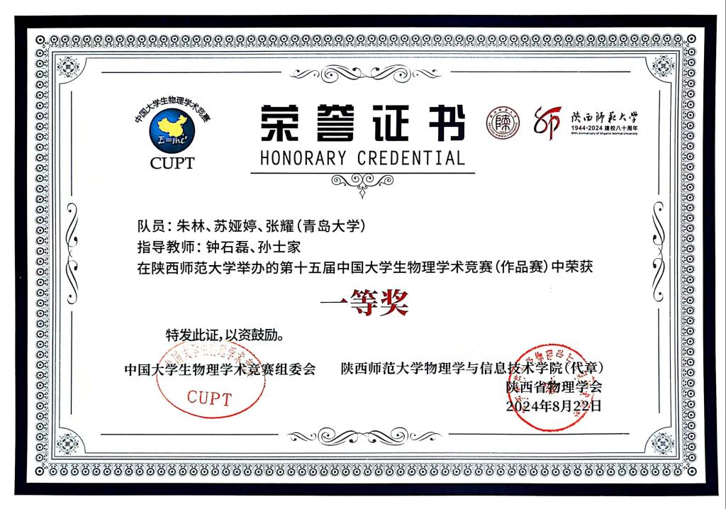 8月18—23日,第十五届中国大学生物理学术竞赛(CUPT)国赛在陕西师范大学胜利举办,来自哈尔滨工业大学、复旦大学、北京大学、山东大学等国内91所高校的92支队伍展开了激烈角逐。由胜游体育(SYsports)官方网站入口三位本科生组成的青岛大学代表队,最终在作品赛道荣获一等奖,创造历史最佳成绩,并实现该项赛事在2024年度山东省赛、华东区赛、全国赛的大满贯。