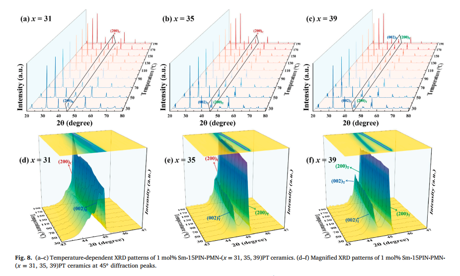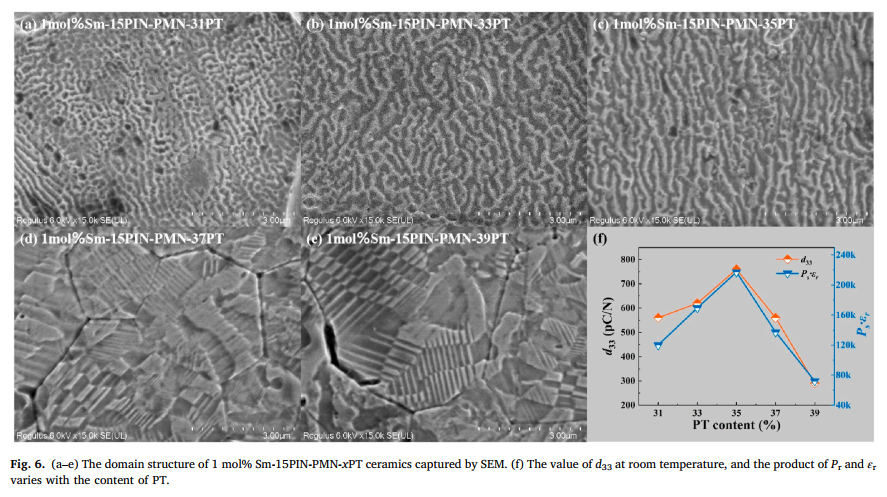 该工作通过两步烧结法制备了Sm掺杂15PIN-PMN-xPT透明压电陶瓷,通过调节PMNPT的固溶配比(x=31,33,35,37,39),分别得到了三方相为主,三方相四方相共存,和四方相为主的透明压电陶瓷。结果表明,当物相结构为四方相稍多于三方相的三方-四方共存结构时,能够诱导出水痕畴和条纹畴共存的混合畴结构,此时的样品具有最佳的综合性能。其中,1molSm-15PIN-50PMN-35PT陶瓷在室温条件下的压电系数d33可达到760 pC/N,光学透过率T能够达到62% @ 2000 nm,并且其居里温度达到了187.4℃。变温测试结果表明,当温度达到96℃附近时,三方-四方相的耦合达到最佳状态,样品的d33可达到1100 pC/N,高于目前该体系已报道的性能。本工作所制备的PIN-PMN-PT透明压电陶瓷具有优异的压电、透光及温度稳定性,未来在透明光声换能器及医学光声成像等领域具有较大的应用潜力。