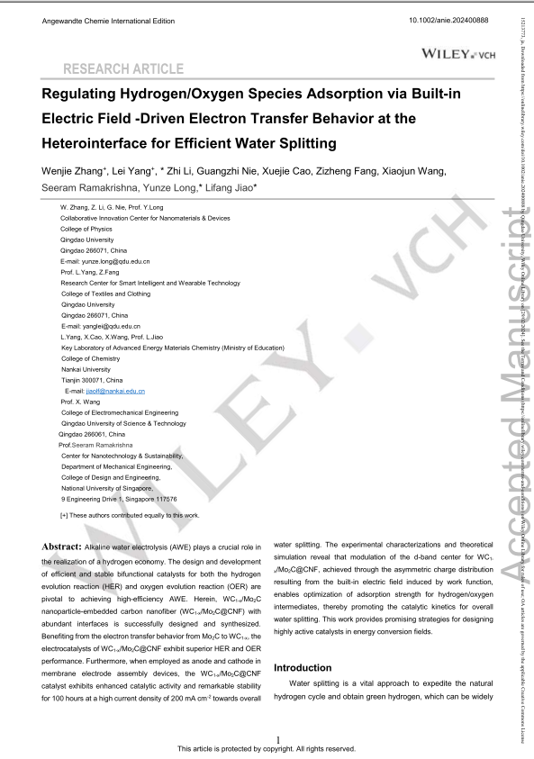 近日,学院物理学2022级硕士生张文洁(导师龙云泽教授)在化学领域顶级期刊《德国应用化学》Angewandte Chemie-International Edition(影响因子16.6)以第一作者身份发表了题为“Regulating Hydrogen/Oxygen Species Adsorption via Built-in Electric Field -Driven Electron Transfer Behavior at the Heterointerface for Efficient Water Splitting”的研究论文(Angew. Chem. Int. Ed. 2024, e202400888)。南开大学焦丽芳教授、胜游体育(SYsports)官方网站入口龙云泽教授与纺织服装学院杨磊副教授为该论文的通讯作者。杨磊副教授同时是论文共同第一作者。