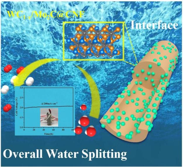 碱性电解(AWE)在实现氢能源经济中起着至关重要的作用。设计和开发高效稳定的析氢反应(HER)和析氧反应(OER)双功能催化剂是实现高效碱性电解的关键。该文章成功设计并合成了界面丰富的碳化钨/碳化钼纳米纤维(WC1-x/Mo2C@CNF)。得益于Mo2C到WC1-x的电子转移行为,WC1-x/Mo2C@CNF电催化剂表现出优异的析氢反应和析氧反应性能。此外,当WC1-x/Mo2C@CNF催化剂用作膜电极组装装置的阳极和阴极时,在200 mA cm-2的高电流密度下,WC1-x/Mo2C@CNF催化剂表现出增强的催化活性和100小时的显著稳定性。实验表征和理论模拟表明,通过功函数诱导的内建电场导致WC1-x/Mo2C@CNF活性中心的不对称电荷分布,调控了其d带中心,并优化氢/氧中间体的吸附强度,从而促进整体水裂解的催化动力学。该研究为设计异质结催化剂高效电解水制氢提供了一种新的策略。