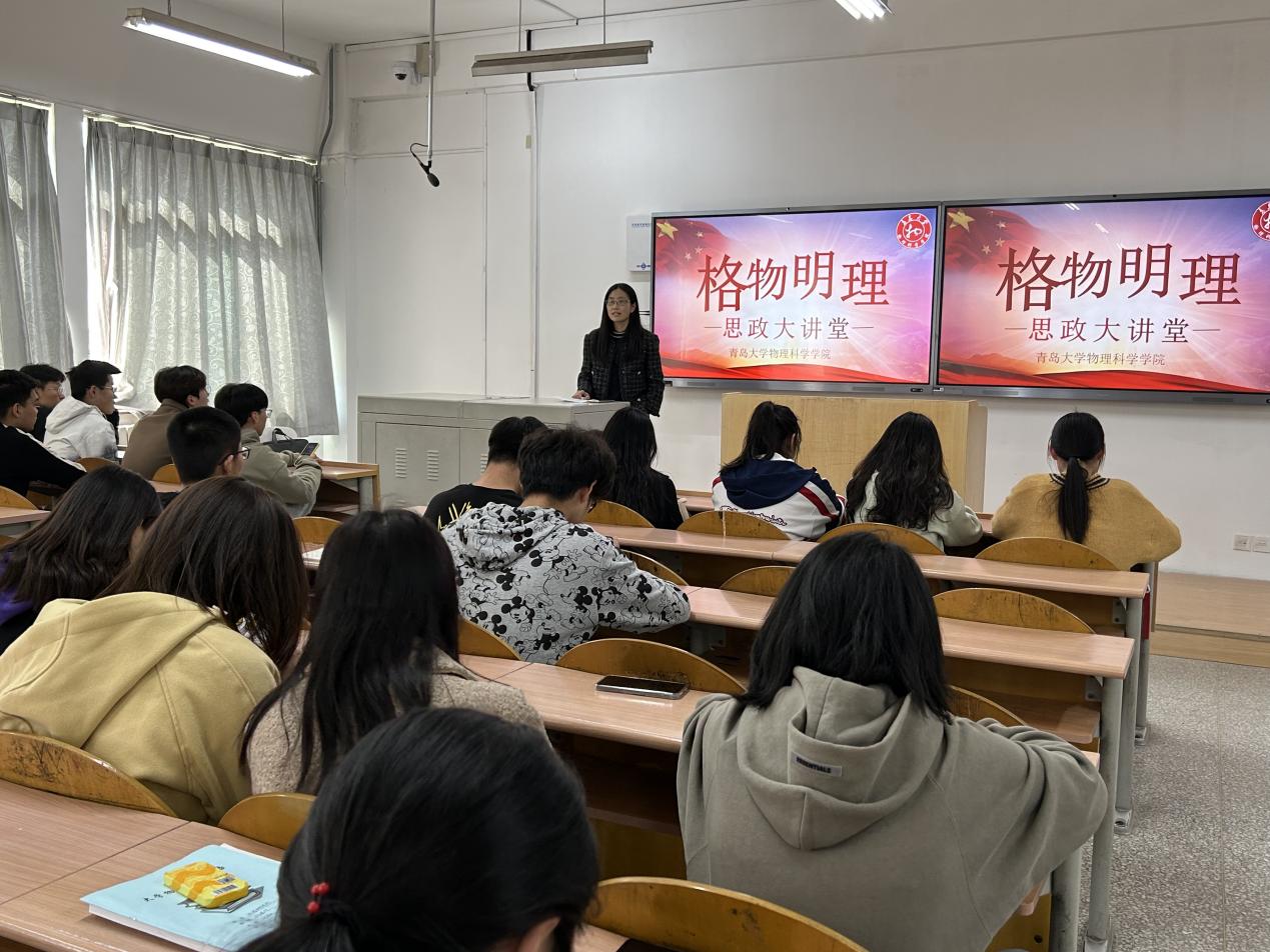 滕冰为应用物理专业学生授课,她通过分析中美关系、中美贸易摩擦等国际大事阐释了物理学的重要性。她指出,科技创新是一个国家和民族发展的不竭动力,新时代的物理学子要在当今世界正经历百年未有之大变局中,自主创新,勇攀世界科技高峰,坚持“四个面向”,不断提高原始创新能力,立志解决国家“卡脖子”难题,敢于攻坚克难,不断续写物理人科技创新事业的新篇章。她勉励同学们要树立浓厚的中国情怀、物理情怀,珍惜学校的教育资源,充分利用学校学院的各类平台,锻炼提升专业能力,努力把自己锻造成创新人才,将来为国家科技事业贡献力量。
