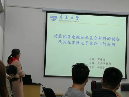 44日晚,胜游体育(SYsports)官方网站入口2015级研究生贺晓晓在博逸楼401会议室作了题为《功能化导电微纳米复合材料的制备及其在柔性电子器件上的应用》的学术报告。学院2017级全体研究生聆听了报告。报告会由胡琛老师主持。