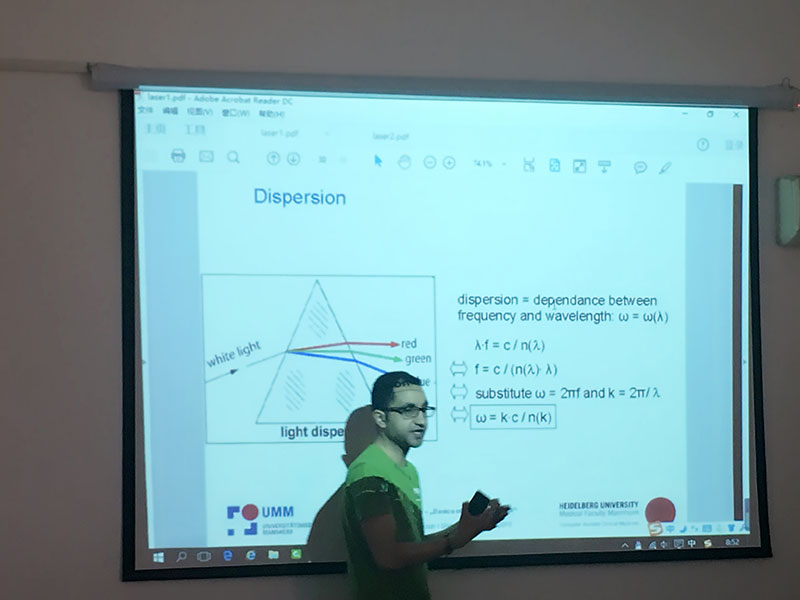 会上,Mostafa首先就激光历史背景、光的性能、麦克斯韦方程组及几何光学等内容详细介绍了激光物理基础知识,阐述了在一定介质中电磁场的变化,并综合以上知识介绍了几种不同类型的激光器。报告结束后,他就同学们提出的光纤通信的基本原理、如何将科研做细以及如何做好科研等问题做了详细解答。