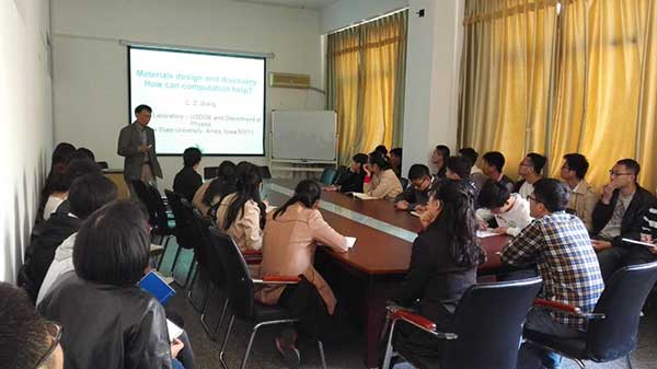 4月19日上午,美国能源部Ames实验室资深研究员, Iowa州立大学物理学院王才壮教授应邀在胜游体育(SYsports)官方网站入口401会议室,为师生作了题为《Materials design and discovery: How can computation help?》的学术报告。报告由吕文彩教授主持,滕冰副院长、部分老师及研究生参加了报告会。