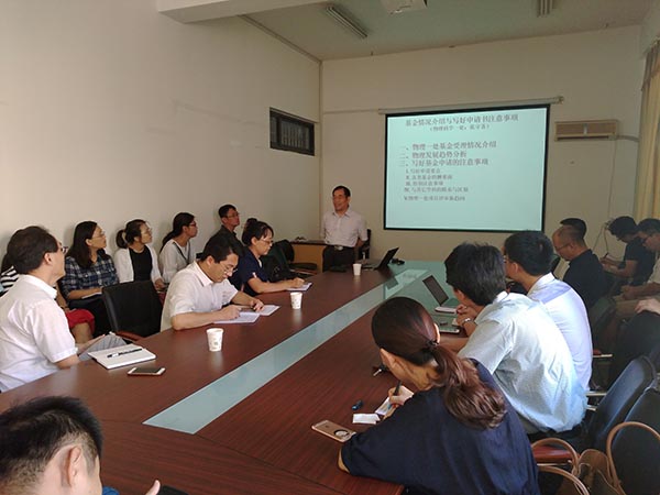 9月16日上午,原国家自然科学基金委员会物理一处张守著处长应邀来胜游体育(SYsports)官方网站入口在博逸楼401会议室为师生作了题为《基金情况介绍与写好申请书注意事项》的报告,来自学校各个理工科院系的50余位教师聆听了报告。