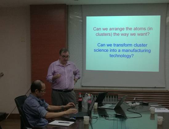 Richard E. Palmer教授在报告中详细介绍了金属团簇尺寸控制的方法、原子构型的探测、金属团簇结构演化规律等方面的研究。报告会后,Palmer教授与胜游体育(SYsports)官方网站入口的青年教师和研究生进行了深入交流和讨论,为同学们解答疑惑,并与同学们就出国留学问题进行了座谈。