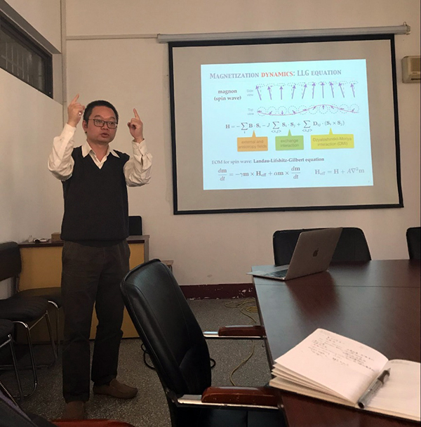 传统计算采用逻辑与存储分离的冯诺依曼计算架构,该架构存在所谓的冯诺依曼瓶颈:逻辑单元与存储单元进行频繁的数据交换极大地限制了计算速度并增大了能耗。磁性材料的磁有序及其磁激发——自旋波或磁子为突破此瓶颈提供了新思路。报告中,肖江教授从铁磁和反铁磁材料出发,介绍了利用磁畴壁结构对自旋波进行调控,特别是对自旋波偏振的调控的相关理论。通过研究铁磁和反铁磁材料畴壁中的自旋波行为,发现畴壁可用于自旋波的传播、折射、反射和偏振等操作,并由此可用于构造各种自旋波器件。相反,通过控制自旋波的线偏振方向也可以有效地移动畴壁。肖江教授提出了通过利用极化自旋波来控制反铁磁条带中畴壁的机制来实现逻辑与存储相结合的非冯诺依曼自旋波计算架构的理论方案。