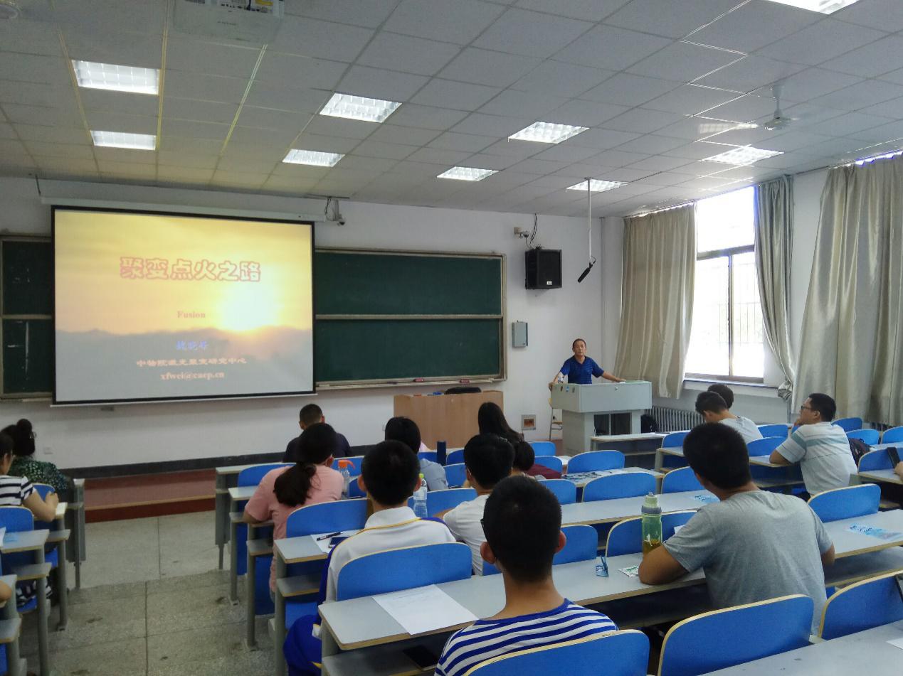 “地球上能源并不是无限的!”魏晓峰从能源稀缺、枯竭谈起,所以,要寻找新能源,从而引出了太阳能——太阳的聚变。魏晓峰从基本概念、研究的基本组成和应用方向等方面系统阐述了激光惯性约束聚变。激光惯性约束聚变需要利用高能量密度物理做牵引,可以用作激光核爆模拟研究的军用方向和惯性约束聚变、聚变能、激光天文学等的民用方向,应用方向极为广泛。最后,魏晓峰给大家介绍了氢弹的基本原理并展望了未来聚变发电站的原理模式图,引发了同学们极大的兴趣。在报告过程中,魏晓峰与同学们不时进行交流,并鼓励大家多深入研究。