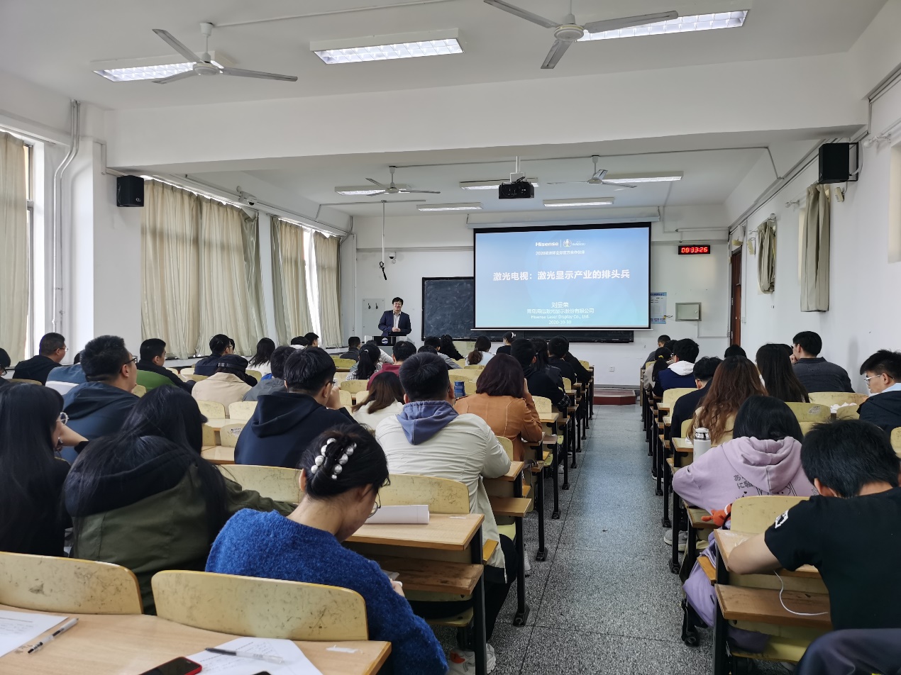 报告中,刘显荣首先为大家展示了电视行业的发展历程,从阴极射线显像管、等离子显示、液晶显示到有机电致发光,电视显示技术为满足消费者的需求不断更新迭代。对于企业而言,选择符合未来产业发展趋势的技术路线至关重要,海信集团正是基于正确的预判,选择了激光电视这一技术。随后,刘显荣详细介绍了激光电视诞生的背景,因为投影技术先天满足更大显示尺寸需求,但当前的投影技术亟待全面升级,所以激光电视应运而生,且极具技术和产业优势。随后,刘显荣对激光器和光源模组、显示芯片、超短焦镜头、光学引擎以及光学屏幕等激光电视的核心器件和模组技术进行了逐一说明。最后,刘显荣向大家展示了海信集团在该技术领域的设计和制造能力的建立过程,并强调该技术未来在家用8K电视和激光显示等领域将大有可为。报告结束后,师生就激光显示的激光散斑控制等与刘显荣进行了深入讨论和交流。