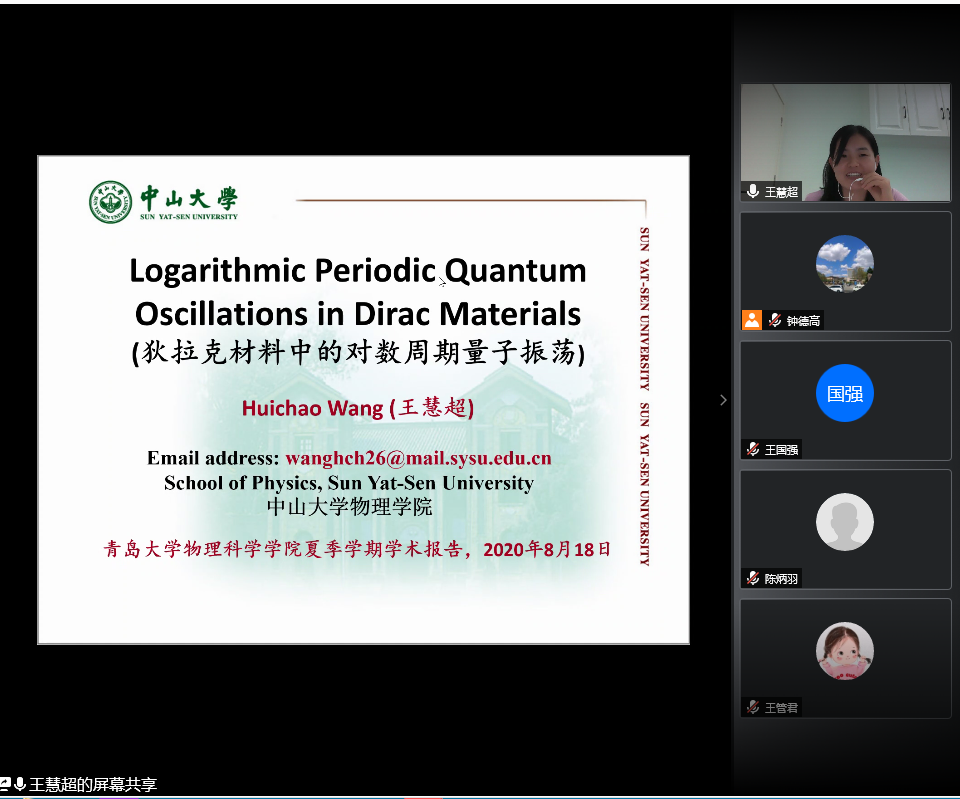8月18日下午,中山大学物理学院王慧超副教授应邀为胜游体育(SYsports)官方网站入口师生作了题为《狄拉克材料中的对数周期量子振荡》的线上学术报告,并介绍了中山大学物理学院的基本情况,作了研究生招生宣讲。报告会由胜游体育(SYsports)官方网站入口应用物理系主任温峥主持,学院部分老师、本科生及研究生参加了报告会。