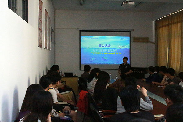 报告从近期举行的“第四届全国海洋技术学术会议”及“海洋传感器创新与发展鳌山论坛”等海洋探测领域相关会议的情况引入,强调了“随着我国自主研发的深潜器和观测平台技术的发展和进步,如何提升深潜器的作业能力、如何借助于这些平台获得有突破性的科学成果,是海洋技术领域关注的焦点”。随后,郑荣儿以时间为主线,围绕海洋探测需求,对课题组近期在发展光谱类海洋传感技术方面取得的进展进行了深入介绍,并站在国家在海洋领域的重大需求的视角上,对在海洋探测领域中光谱技术发展面临的关键问题和未来发展的方向进行了分析。他认为“发展新型海洋原位传感器以适应不同的作业环境、以完成特殊的观测目的成为越来越迫切的需求。这些需求给水下原位光谱技术和深海光谱仪器研发带来了发展机遇,但同时也面临着巨大的挑战”。郑荣儿鼓励学生,物理相关的专业知识在海洋探测的领域大有用武之地。在最后的提问交流环节中,郑荣儿对学生的提问一一给出了详细解答,并邀请老师和学生有机会到中国海洋大学信息工程学院交流学习。