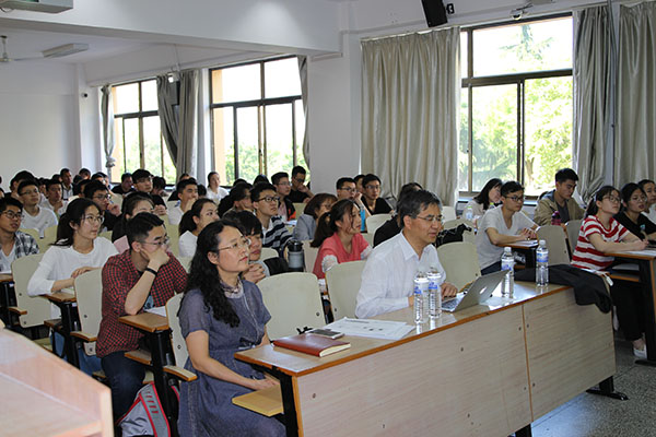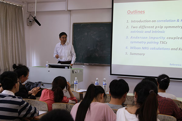 王孝群在报告中首先介绍了什么是强关联体系、处理强关联体系的理论模型Fermi Liquid和凝聚态物理中著名的Kondo效应、Kondo问题,接着介绍了在强关联知识的背景下两种不同的p-波对称成对的拓扑高温超导机制:外来p-波对称成对的高温超导(extrinsic p+ip symmetry pairing SC)和内在p-波对称成对的高温超导(intrinsic p+ip symmetry pairing SC),随后分别介绍了在这两种不同机制的高温超导材料中掺杂Anderson磁性杂质时产生的不同耦合作用,最后介绍了求解p-波对称成对拓扑高温超导体系波函数的Wilson数值重整化方法。他由浅入深地给师生们介绍了当前量子磁性、介观系统等体系中的新奇物理特性及其机理方面的前沿研究。报告结束后,他耐心解答了大家的问题。
