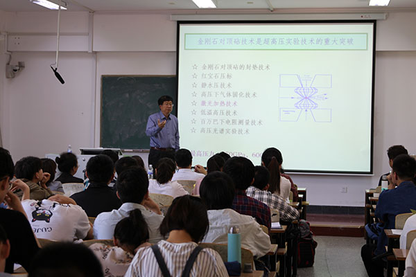 崔田在报告中首先强调了研究科学问题时压强的重要性,介绍了宇宙空间中宏观尺度到微观尺度的压强极限范围、实验室中获得高压的实验技术“静态金刚石对顶砧技术”和“动态超高压技术”,并提到目前实验上可以达到最高压强为550GPa。随后,他介绍了在高压下各种单质和化合物展现出不同于常压的新奇性质,如固态氢、氘的高压新相,高压水分子晶体相图,讲解了卤族固体中高压致使分子解离的物理机制以及陶瓷材料在高压下出现的高温超导性质,强调了理论计算在研究高压科学问题上的重要作用。报告风趣幽默,地给大家展示了一个神奇有趣的高压世界。最后,崔田和师生进行了热烈的互动,耐心解答了大家的问题。
