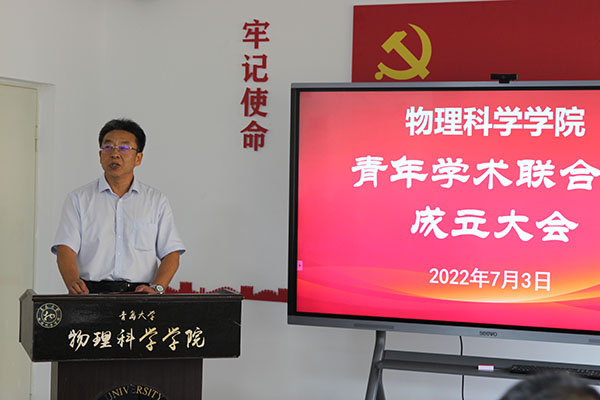 7月3日上午,胜游体育(SYsports)官方网站入口青年学术联合会成立大会暨学术报告会在博逸楼401举行。校党委常委、副校长于永明,山东大学晶体所常务副所长、国家杰青于浩海,科技处处长李荣贵出席大会。学院党委书记郝伟、院长滕冰及联合会成员、师生代表共50余人参加会议,会议由滕冰主持。