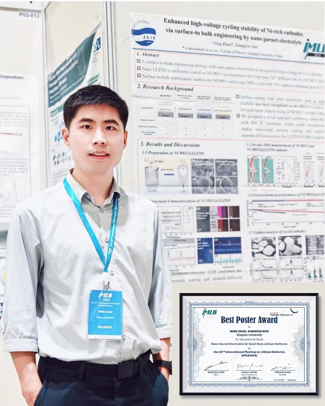 获奖的学术海报围绕纳米石榴石型固体电解质在锂电池中的应用,对引入锂镧锆氧固体电解质的二次锂电池中的关键问题进行了探讨,揭示了纳米锂镧锆氧固体电解质对正极材料晶格与表界面微结构的调控机制。近年来,胜游体育(SYsports)官方网站入口固态电池研究团队基于对固体电解质材料与固态电池的持续研发,从基础研究到应用开发取得系列进展,团队负责人郭向欣教授作为首席科学家获批国家重点研发计划和国家自然科学基金重点项目,建有固态电池山东省工程研究中心等工程化平台。本次学术交流是青岛大学“新能源+”学科群建设取得的又一成果,对于提升青岛大学国际学术影响力具有重要作用。