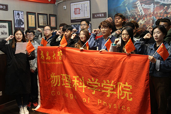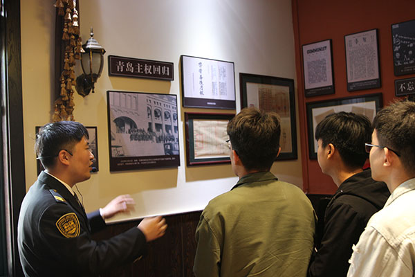 参观期间,讲解员对“五四运动与青岛”的有关历史进行了详细介绍,大家通过老照片、老档案、纪录片回顾了德占青岛、日德战役、签订“二十一条”、新文化运动兴起、巴黎和会外交失败、五四运动爆发、中国共产党成立等一系列历史事件,知悉了“保家保国,还我青岛”的历史渊源,观看了《胶州湾独占地图》《民国家书》《山东省财政厅洪宪年号买税契》等若干珍贵史料,全面了解了五四运动的社会背景、基本过程和历史意义。参观结束后,全体青年学生重温入团誓词并郑重宣誓。