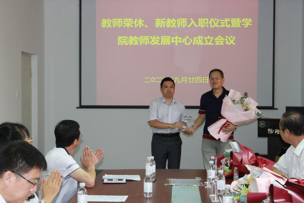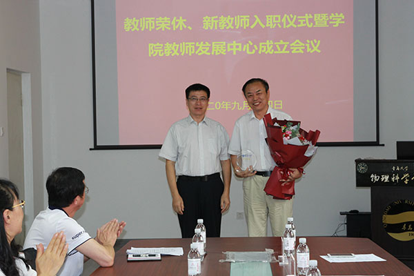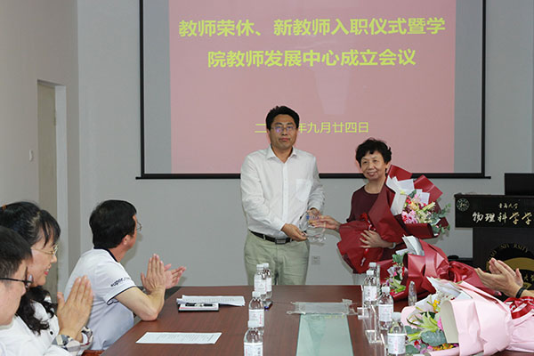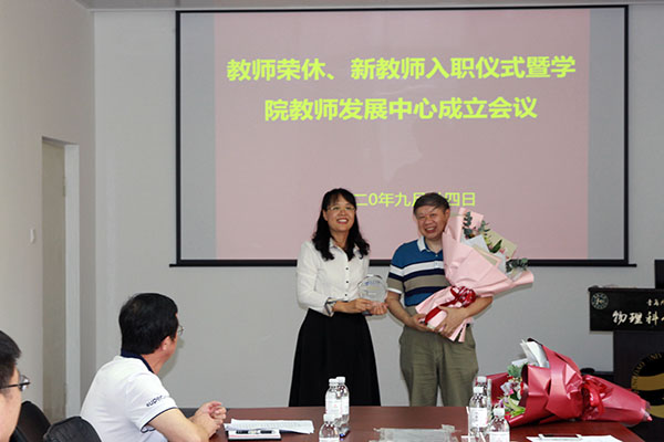 郝伟在主持时说,荣休老师是“四有”好老师,为学院的发展做出了卓越贡献,衷心祝愿荣老师退休后生活更加多姿多彩,也欢迎常回家看看!希望新入职教师要接好这个接力棒,薪火相传,共同为把学院办成学校、家庭和社会都满意的学院而努力奋斗!