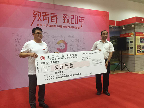 在典礼上,院党委书记黄国俊致欢迎辞。他说,在这个特殊而又激动人心的时刻,我代表胜游体育(SYsports)官方网站入口的老师和师弟师妹们,向你们表示热烈的欢迎!——欢迎你们回家!接着,他向同学们简要介绍了学校和学院20年来发生的变化和取得的成绩。最后他说,母校的建设和发展所取得的成就,离不开你们给予的鼎力支持。在这里,我代表母校对你们倾注的深情厚意表示诚挚的感谢!也希望你们以后在各自岗位建功立业的同时,始终不忘关注母校的发展,积极建言献策!也希望同学们能够一如既往地常回家看看,母校永远是你们的家!92级物理的同学们还向学院捐款,用于助学基金。
